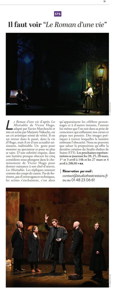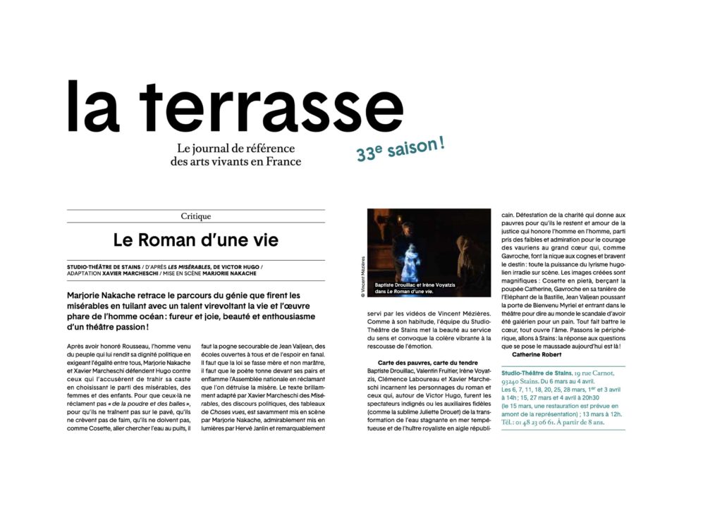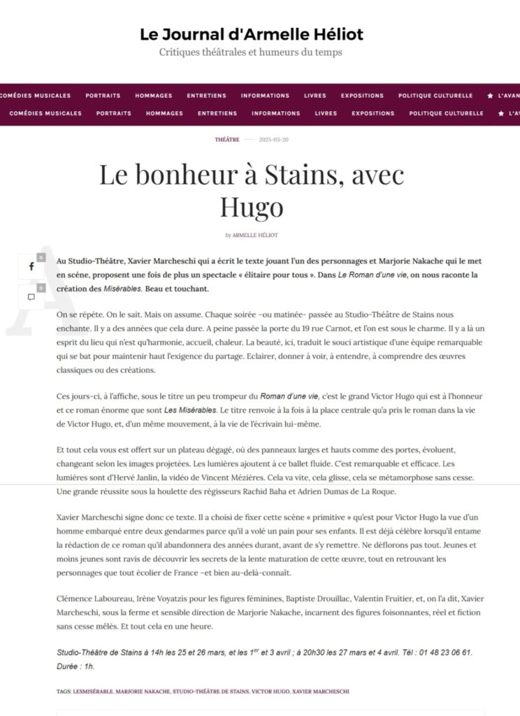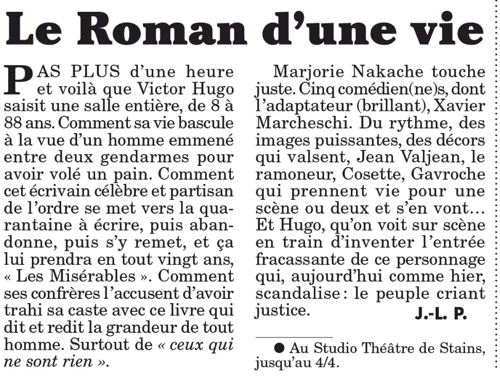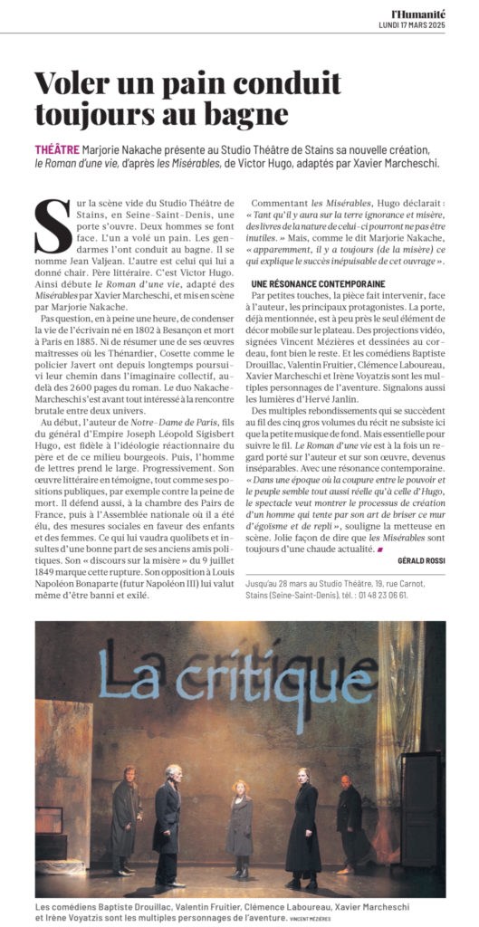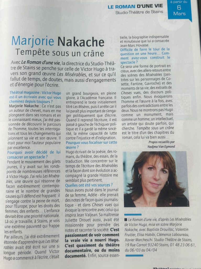 Le spectacle ne montre pas Les Misérables, mais un auteur écrivant Les Misérables. Dans une époque où la coupure entre le pouvoir et le peuple semble tout aussi réelle qu’à celle d’Hugo, le spectacle veut montrer le processus de création d’un homme qui tente par son art, de briser ce mur d’égoïsme et de repli. »