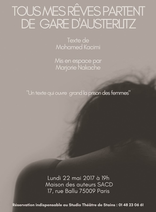 « Écrite à la suite de longues immersions à la Maison d’arrêt des femmes à Fleury-Mérogis, cette pièce se veut un hommage à ces femmes recluses, enfermées dans la plus haute des solitudes, souvent, trop souvent même, victimes de la violence des hommes, et qui, privées de tout, parviennent tout de même à réinventer un monde où elles jouent à ne manquer ni de liberté ni d’humanité. »  Mohamed Kacimi