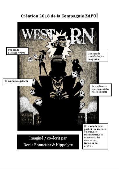 West RN c’est presque un western, un road movie, une balade imaginaire dans les plaines sauvages de l’Ouest, une épopée étrange où la route nationale n°4 zigzague entre les cactus et où les restos routes sont infestés de bandits. L’objectif est de proposer au public une lecture d’une bande dessinée vivante, empruntant au théâtre de marionnettes sa science de la mise en mouvement. Le texte et les dialogues existeront à travers la bulle, les onomatopées, les cadrages, les juxtapositions de cases dans un même champ visuel seront les codes utilisés au service de la dramaturgie.